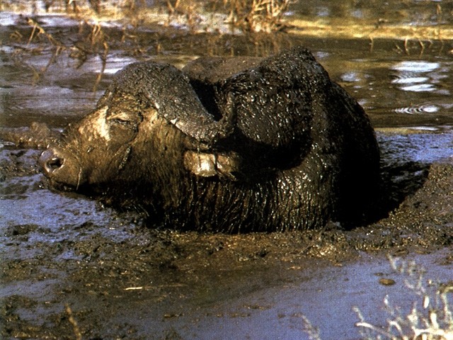 Der afrikanische Kaffernbüffel badet ausgiebig und suhlt sich mit Vorliebe im Schlamm. Dadurch verschafft er sich Kühlung und versucht, Zecken und andere Hautschmarotzer loszuwerden.