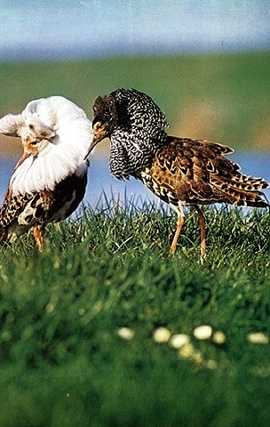 Auf kurzrasigen Turnierplätzen vollführen die Kampfläufer-Männchen turbulente Scheinkämpfe. Die dabei gebildeten Platz-Rangordnungen hängen wahrscheinlich auch mit der Färbung der Halskrause zusammen.