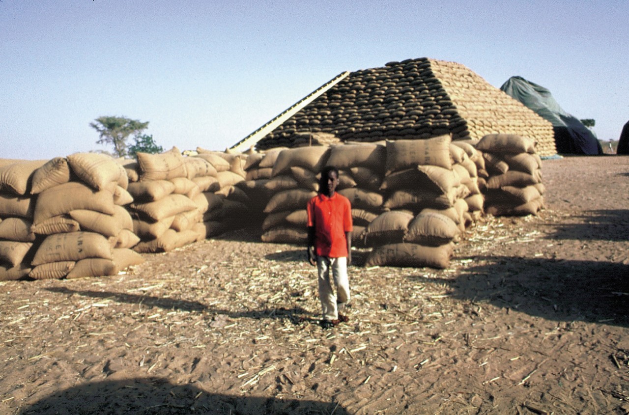 Zum Trocknen werden die mit Erdnüssen gefüllten Säcke zu Pyramiden geschichtet. Nigeria ist einer der führenden Erdnussproduzenten der Welt.
