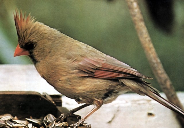 Der Rote Kardinal - hier ein Weibchen - ist durch einen kurzen, kräftigen und spitzen, an der Wurzel sehr breiten Schnabel und durch einen aufrichtbaren Schopf gekennzeichnet.