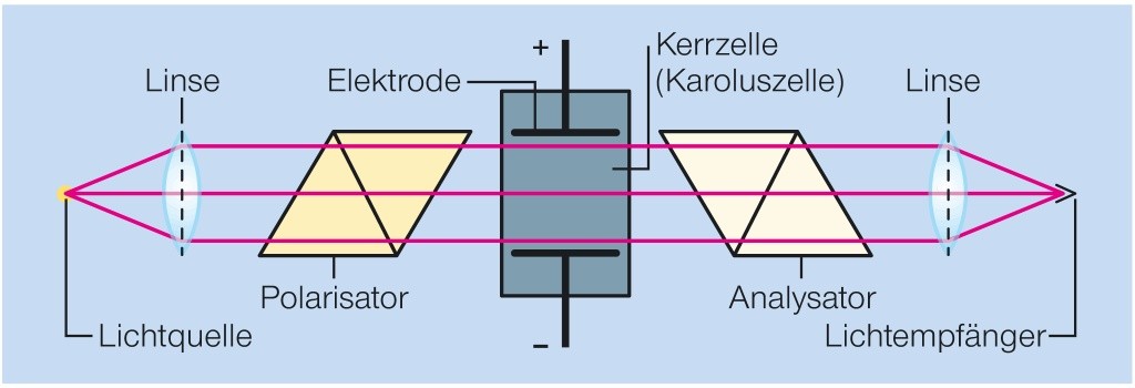 Gerät zur Umwandlung elektrischer Stromschwankungen in entsprechende Lichtschwankungen mit Hilfe des elektrooptischen Kerr-Effekts: Ein Lichtstrahl durchläuft zwei gekreuzte Nicol’sche Prismen, die einen gewissen Abstand voneinander haben. In dem dazwischen befindlichen isotropen Medium (meist Nitrobenzol) wird ein von einem Sender gesteuertes elektrisch veränderliches Feld erzeugt, das die Polarisationsebene des Lichts dreht (Kerr-Effekt), so dass der aus dem zweiten Prisma austretende Lichtstrahl entsprechende Intensitätsschwankungen erleidet. Technische Anwendung der Kerr-Zelle z. B. beim Tonfilm.