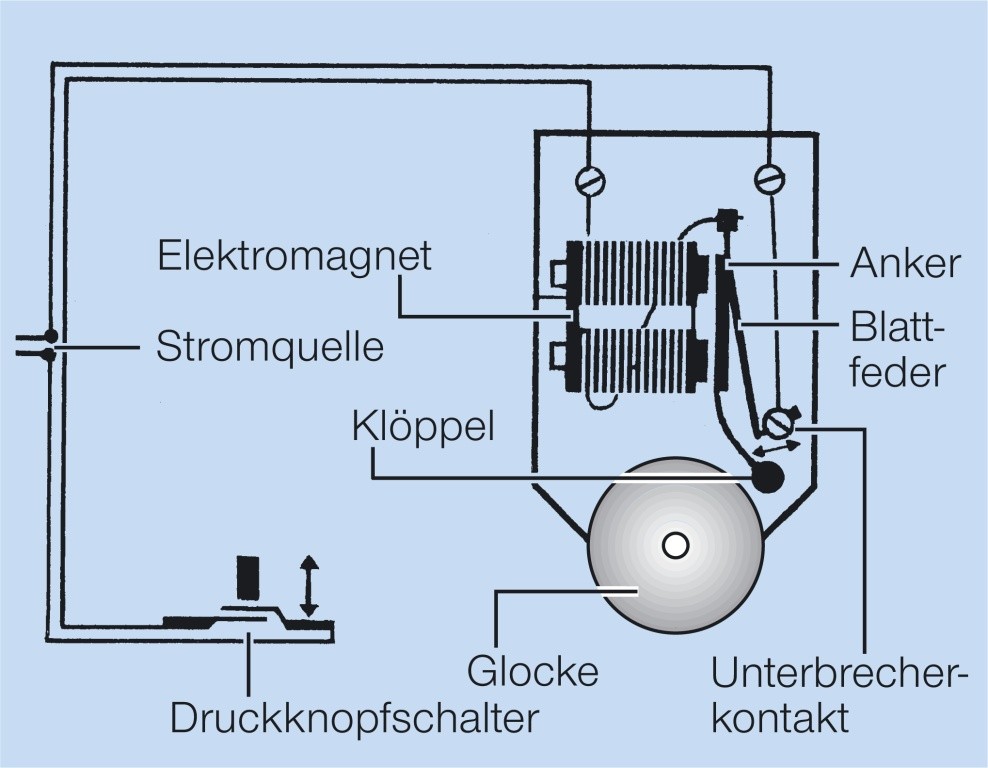 eine elektroakustische Signalvorrichtung, bei der über einem Elektromagneten ein Anker mit Klöppel befestigt ist, der bei Stromdurchfluss angezogen wird. Dabei unterbricht er selbsttätig den Strom und kehrt in die Ruhelage zurück, so dass der Strom wieder fließt usw. Der Klöppel schlägt an eine Glocke.