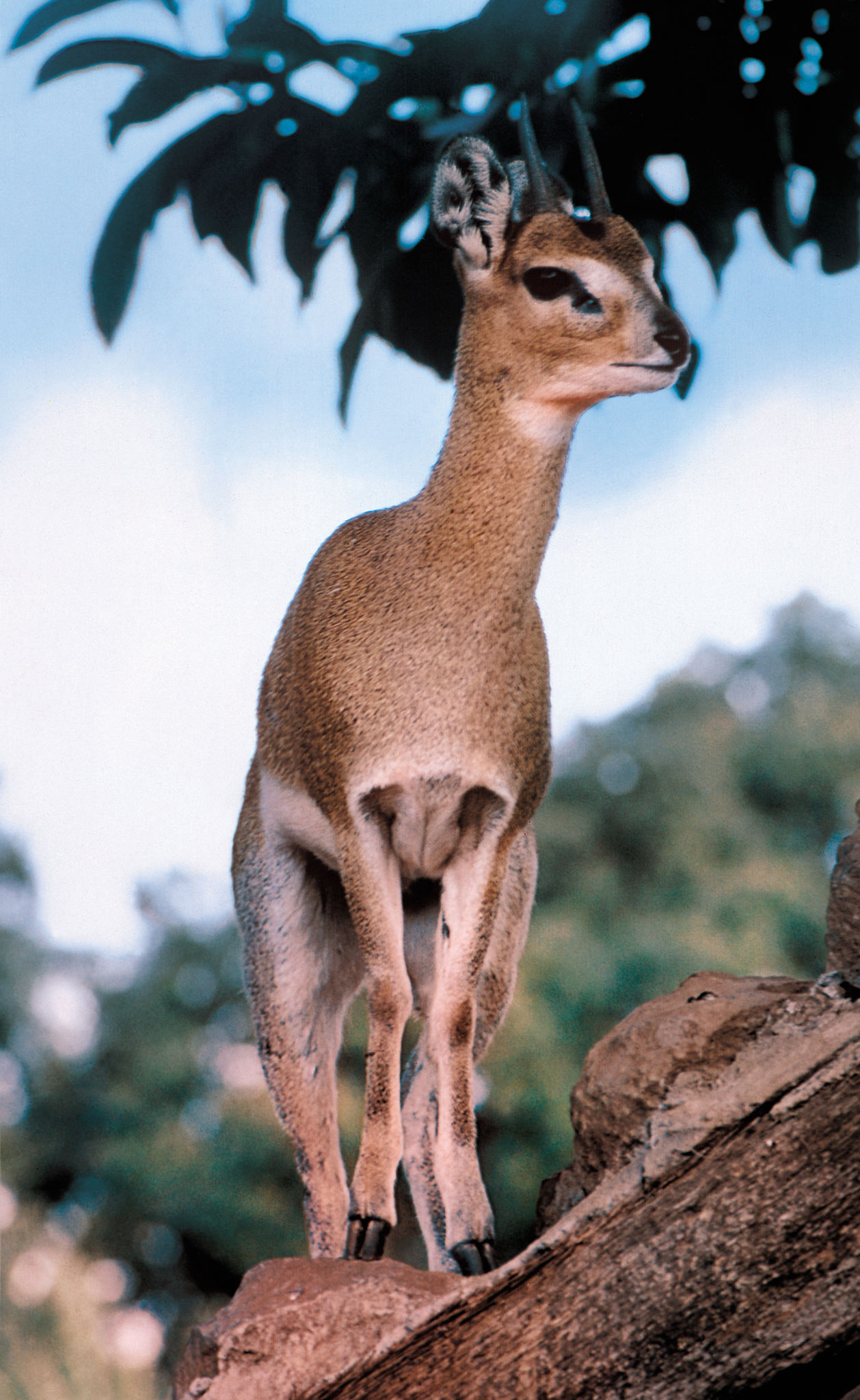 Die gedrungene Gestalt mit den kräftigen Läufen zeichnet den Klippspringer als einen Felsenbewohner aus. Das etwa 60 cm hohe Tier ist ein gewandter Kletterer und Felsspringer, dem auch die unscheinbarste Unebenheit noch festen Halt bietet.