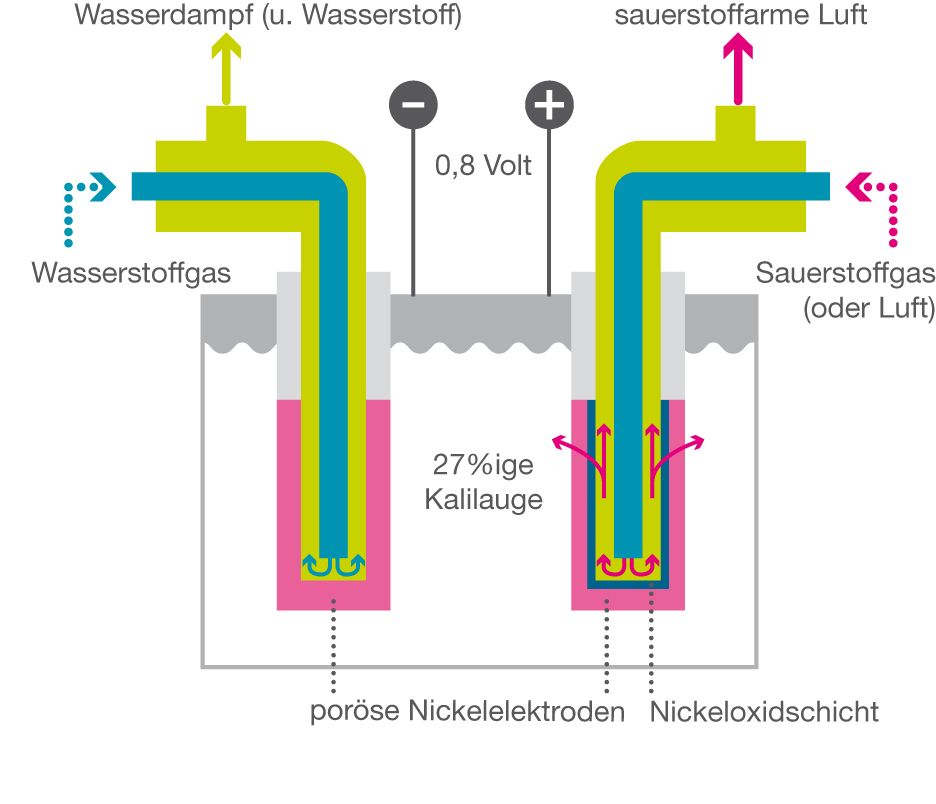 ein galvanisches Element, als elektrische Energiequelle 1955 von F. T. Bacon entwickelt; Prinzip: In eine 27%ige Kalilauge als Elektrolyt tauchen zwei poröse, hohle Nickelelektroden, in die Sauerstoff- bzw. Wasserstoffgas eingeleitet wird. An der Anode bildet sich eine dünne Nickeloxidschicht aus, die das Sauerstoffgas aktiviert und absorbiert, so dass die Sauerstoffatome mit dem Wasser des Elektrolyten OH-Ionen bilden können. Die OH-Ionen wandern zur Kathode und bilden mit aktiven Wasserstoffatomen Wasser. Dabei werden Elektronen frei, wodurch eine Potenzialdifferenz von 0,8 Volt zwischen den Elektroden entsteht. Der Wirkungsgrad beträgt bei 200 °C und einem Druck von 42 bar bei einer Entnahme von 25 A etwa 65% (Wärmekraftmaschine mit Generator: 25–30%).