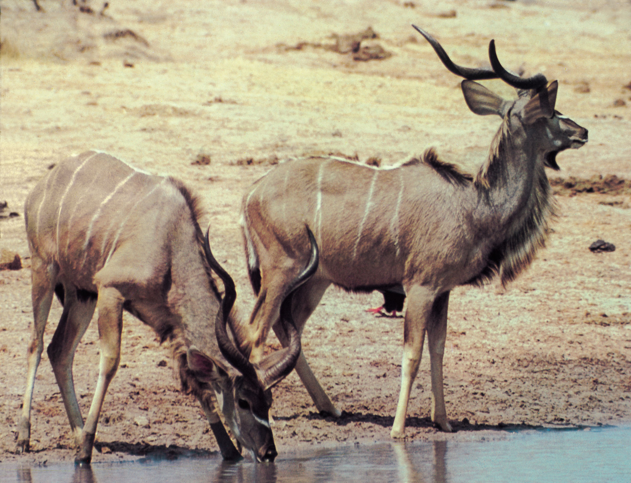 Die Bullen des Großen Kudu tragen ein prächtiges Schraubengehörn. Zu einer mächtigen Nacken- und Rückenmähne wächst ihnen eine mächtige Halsmähne, die sie beim Imponierverhalten deutlich darbieten.