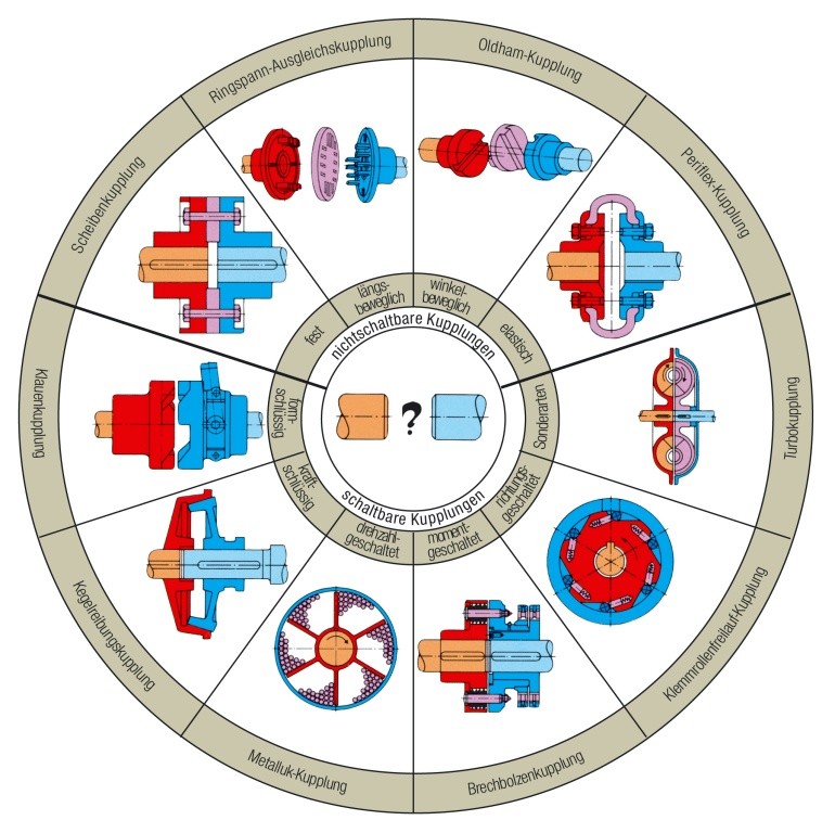 ein Maschinenteil zur Verbindung zweier beweglicher Teile; Arten: feste Kupplung; Schalenkupplung (Hülsenkupplung): Zwei Schalenhälften werden auf die zu verbindenden Wellen gelegt, gegen Verdrehung durch Keile gesichert und mit Schrauben oder Ringen zusammengezogen. Scheibenkupplung: Auf jedes Wellenende wird eine Scheibe (Flansch) aufgezogen; die Scheiben werden mit Schrauben verbunden. Bei elastischen Kupplungen werden statt der Schrauben mit Gummi-, Lederhülsen u. Ä. versehene Bolzen auf einer Scheibe eingeschraubt, die in entsprechende Bohrungen der anderen eingreifen. Ausrückbare Kupplung: bei stillstehender Welle meist als Klauenkupplung, wobei ein Kupplungsteil auf der Welle verschiebbar ist; bei laufender Welle als Reibungskupplung: Die Mitnahme wird durch Reibung der gegeneinander gepressten Scheiben erzwungen. Konuskupplung: Zwei konische Scheiben werden ineinander gedrückt. Lamellenkupplung: Mehrere dünne Stahlscheiben werden gegeneinander gepresst und nehmen erst mit zunehmendem Druck die stillstehende Welle mit. Elektromagnetische Kupplung: Eine Scheibe ist mit einer magnetisierbaren Masse (feines Eisenpulver mit Öl vermischt) versehen, so dass sie beim Einschalten des Gleichstroms die andere Scheibe mitnimmt; besonders geeignet für Umkehrgetriebe beispielsweise in Langhobelmaschinen. Fliehkraftkupplungen treten erst bei Erreichung einer bestimmten Geschwindigkeit in Tätigkeit.