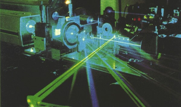 Im verdunkelten Labor macht der Rauch einer Zigarette die Strahlen einer Laseranlage deutlich sichtbar.
