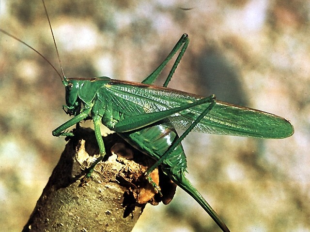 Laubheuschrecken besitzen - im Gegensatz zu den Feldheuschrecken - lange Antennen und einen langen Legesäbel, mit dessen Hilfe die Eier in den Boden oder in Pflanzen abgelegt werden. Die meisten Laubheuschrecken sind, wie dieses Große Grüne Heupferd, räuberisch.