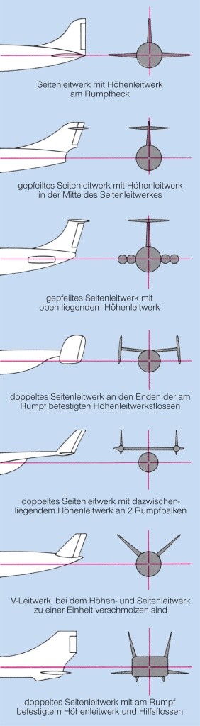 Flugzeugbauteil zur Stabilisierung der Fluglage und Steuerung des Flugzeugs; besteht aus meist am Rumpfende angeordneten Leitwerksflächen, die im allgemeinen unterteilt sind in einen feststehenden Teil (Dämpfungsflächen, Flossen) und einen beweglichen Teil; speziell das Höhenruder und das Seitenruder. Querruder.