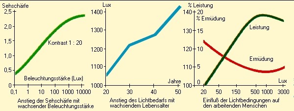 Die Diagramme verdeutlichen die Abhängigkeit menschlicher Sehleistungen von den Lichtverhältnissen.