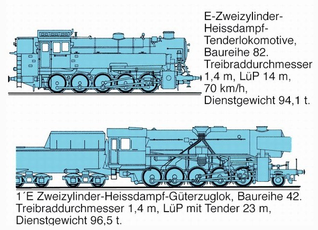 1. Dampflokomotiven mit einer (Hochdruck-)Dampfmaschine als Triebwerk. Der Dampfkessel besteht aus dem auf dem Rahmen ruhenden Langkessel mit den Rauchrohren und dem hinten angefügten Stehkessel, in dem sich die vom Heizer bediente oder mechanisch betätigte Feuerung befindet. Die bei der Verbrennung entstehenden heißen Gase werden in sog. Rauchrohren durch den Kessel in die Rauchkammer unter dem Schornstein geleitet. Dampf von 12–16 bar, vereinzelt auch bis 20 bar, strömt aus dem Kessel durch die in den Rauchrohren befindlichen Überhitzerrohre, in denen er auf etwa 350–400 °C überhitzt wird, in die 2, 3 oder 4 am Rahmen befestigten Zylinder der Kolbenmaschine, deren Kurbelstangen die Treibräder bewegen. Die Dampflokomotiven sind in der Bundesrepublik Deutschland seit 1976 durch andere Lokomotiven ersetzt worden.