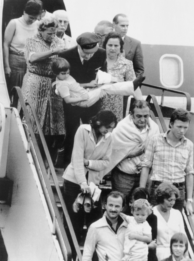 Am 13. Oktober 1977 entführen arabische Terroristen eine Lufthansamaschine in die somalische Hauptstadt Mogadischu, um den Austausch von 11 deutschen und 2 türkischen Häftlingen zu erpressen. Die Geiselnahme wird am 18. Oktober 1977 durch die deutsche Spezialeinheit GSG 9 beendet. Im Bild die befreiten Geiseln bei ihrer Rückkehr in Frankfurt am Main.