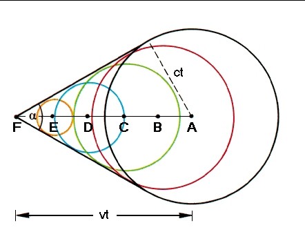 Die Wellenberge der Schallwellen haben eine gemeinsame Einhüllende, den Machschen Kegel. Ein Düsenjet, der schneller als der Schall fliegt, fliegt seinen eigenen Schallwellenfronten davon. Als der Jet bei A war, sandte er einen Wellenberg aus, der sich in der Zeit t auf den Radius ct ausgebreitet hat. In derselben Zeit ist der Jet bis zu F vorgestoßen; dabei hat er den Wellenberg überholt, denn wegen v>c gilt: AF = vt>ct. Auch die unterwegs bei B, C, D und E ausgesandten Wellenberge überholen sich gegenseitig, obwohl jeder später „auf die Reise geschicktö wurde als sein Vorgänger. Dieser sogenannte Machsche Kegel behält also einen ganz bestimmten Öffnungswinkel bei, während er sich mit derselben Geschwindigkeit v wie der Jet vorwärtsschiebt.