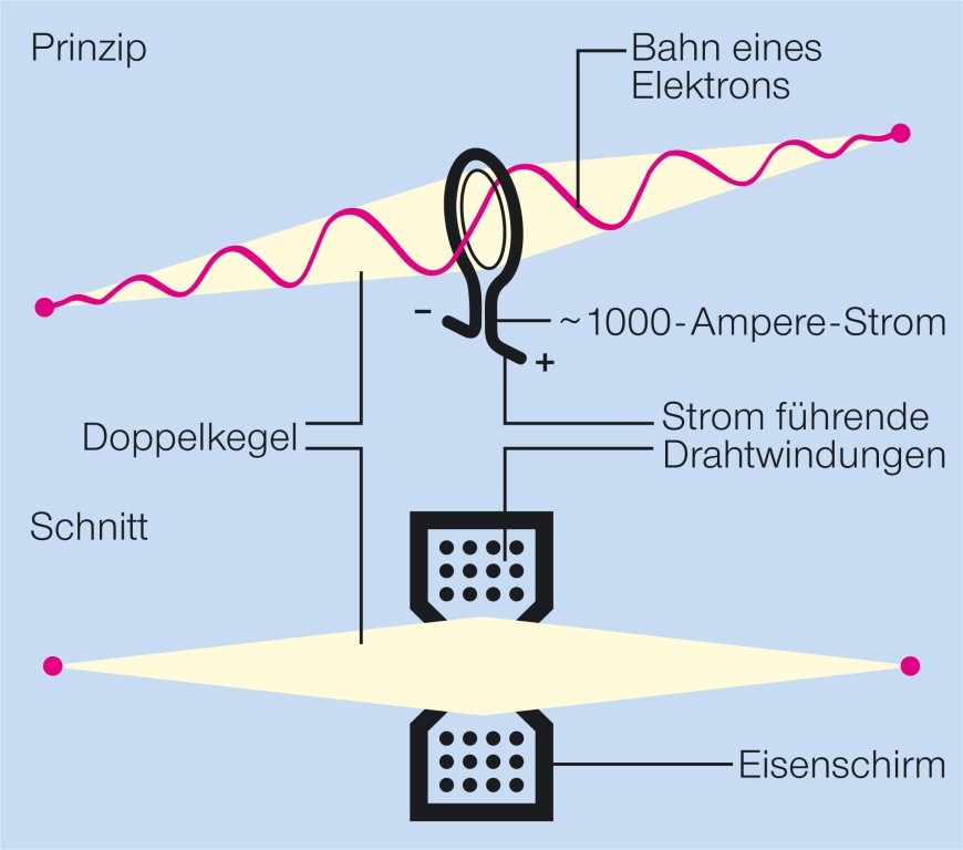 Spule, deren rotationssymmetrisches Magnetfeld durch einen Eisenmantel auf einen kleinen Bereich konzentriert ist. Das Magnetfeld wirkt dann auf bewegte Elektronen wie eine optische Linse. Die „Strahlenbegrenzung“ ist durch einen Doppelkegel gegeben. Ein Elektronenmikroskop ist aus drei magnetischen Linsen aufgebaut.