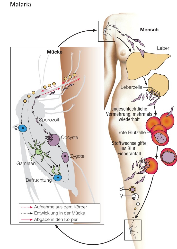 Wechselfieber; Sumpffieberweltweit in den Tropen und z. T. auch in den Subtropen verbreitete Infektionskrankheit, die durch einzellige Lebewesen im Blut (Plasmodien) hervorgerufen wird. Die Krankheit ist meldepflichtig. Als Zwischenwirt dient den Plasmodien Fiebermücken (Anopheles); durch ihren Stich gelangt der Erreger in die Blutbahn des Menschen, dringt in dessen Leber ein, wo er sich durch ungeschlechtliche Teilung (Schizogonie) massenhaft vermehrt. Diese ein- bis mehrwöchige Phase verläuft zunächst ohne Krankheitssymptome (Inkubationszeit). Die hierbei entstehenden Merozoiten befallen die roten Blutkörperchen, machen erneut eine Vielfachteilung durch und zerstören dabei die Blutzellen. Ihr Zerfall wird von einem Fieberanfall und Schüttelfrost begleitet. Die freien Merozoiten befallen erneut rote Blutkörperchen, und der Vorgang wiederholt sich. Je nach Beteiligung der verschiedenen Arten von Plasmodien lassen sich drei Formen von Malaria unterscheiden: