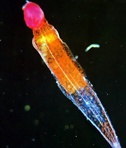 Appendikularien haben als einzige Manteltiere zeitlebens einen Schwanz, der im Winkel von etwa 90° an dem eigentlichen Körper sitzt. Bei der abgebildeten Oikopleura longifurca ist er besonders groß.
