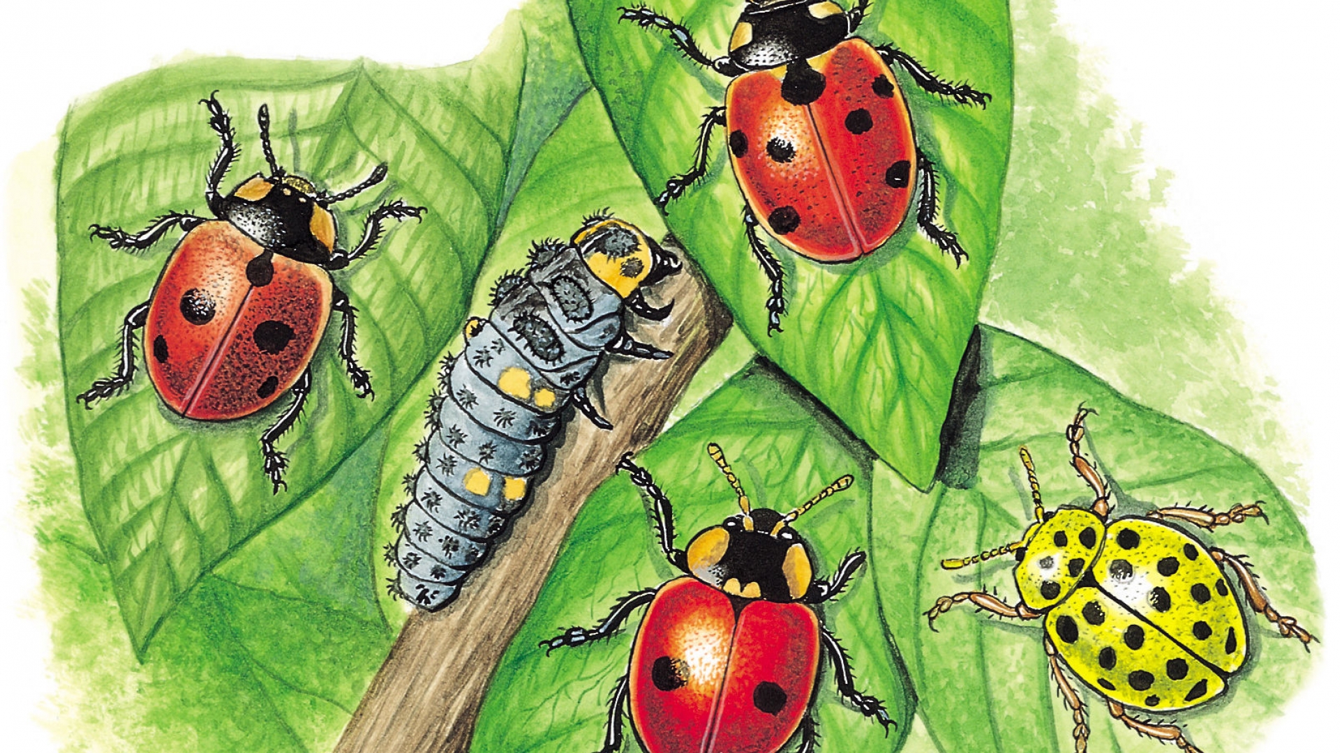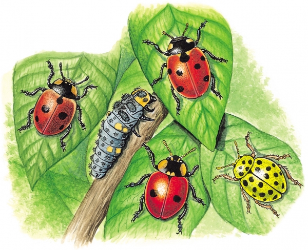 Familie der Käfer mit weltweit ca. 4000 Arten. Die halbkugeligen Käfer tragen auffällige schwarze, gelbe oder rote Punkte auf leuchtend roten, braunen, schwarzen oder gelben Flügeldecken; Zahl und Anordnung der Punkte variieren von Art zu Art, aber auch von Individuum zu Individuum. Die Marienkäfer und ihre Larven ernähren sich vorzugsweise von Blattläusen und sind daher äußerst nützliche Schädlingsvertilger. Häufigste Art ist bei uns der Siebenpunkt, Coccinella septempunctata, Käfer des Jahres 2006.