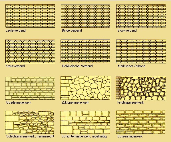 die verschiedenen Verbindungen der Steine zu einem Mauerwerk. Sie gewährleisten durch gleichmäßigen Fugenversatz eine sichere Übertragung der Druckkräfte. Bei künstlichen Steinen werden unterschieden: Läufer-, Binder-, Blockverband u. a., bei den Natursteinen: Verbände für Quader-, Zyklopen-, Schichtenmauerwerk u. a.