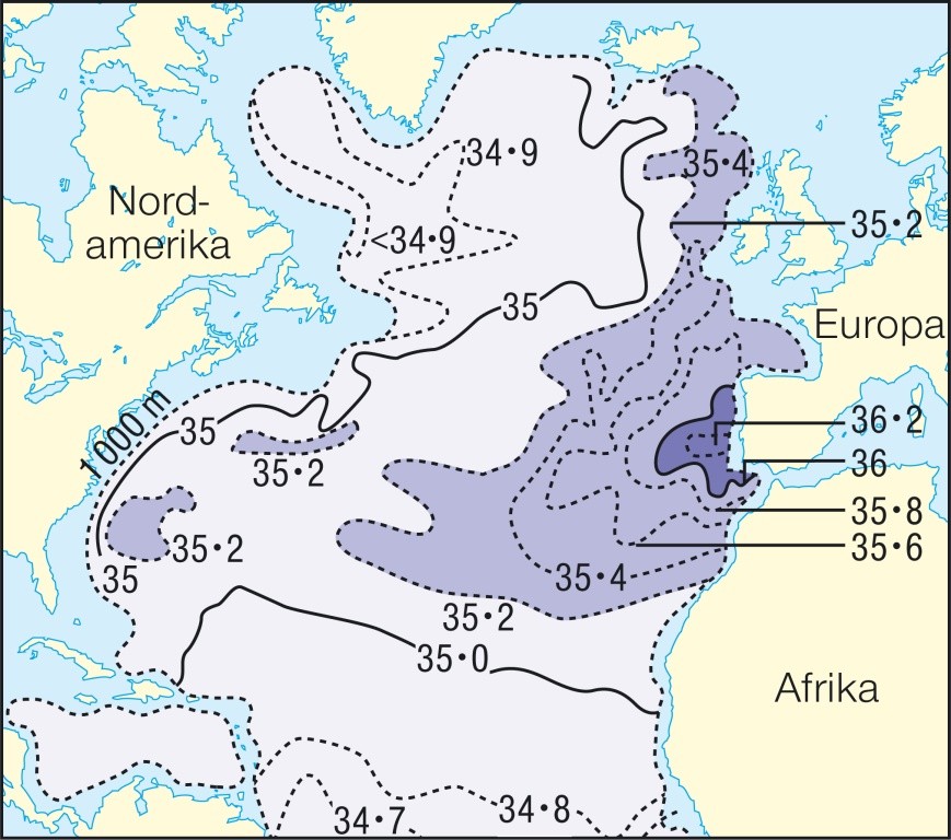 Verteilung des Salzgehalts (Mittelmeerwasser in Atlantik)