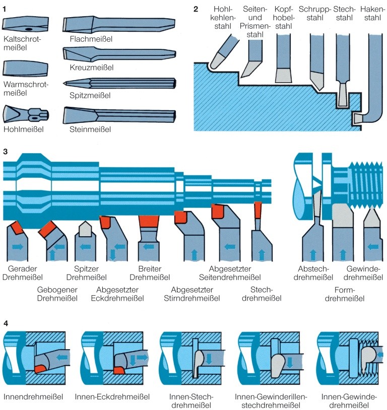 Stahlwerkzeug zum Abtrennen von Spänen von einem Werkstück, vorn mit einer gehärteten und geschliffenen Schneide. Je nach dem Gebrauchszweck gibt es verschiedene Formen, z. B. Flachmeißel, dünn und breit, für Oberflächenarbeit und zum Durchtrennen von Werkstoff; Kreuzmeißel, hinter der Schneide seitlich verjüngt, an den Kanten keilförmig, zum Aushauen von Schlitzen und Nuten; Steinmeißel, meist mit runder, innen hohler Schneide und gezackt, zum Stemmen von Löchern in Stein oder Mauerwerk. – Meißel werden auch die an Werkzeugmaschinen vorhandenen Schneidwerkzeuge genannt.