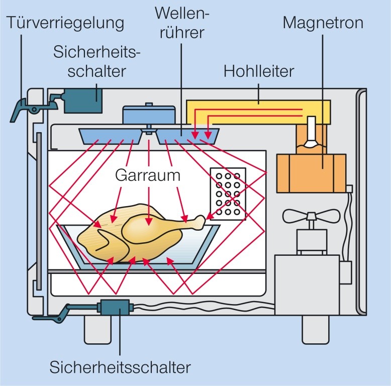 Gerät zum Garen von Lebensmitteln und zum Auftauen und Erwärmen gegarter Produkte mit Hilfe von elektromagnetischen Strahlen der Frequenz von 2450 MHz. Die im Mikrowellenherd behandelten Produkte besitzen fast keine elektrische Leitfähigkeit. Deshalb wird die absorbierte elektromagnetische Energie in Wärme umgewandelt. Die so behandelten Lebensmittel gelten als gesundheitlich unbedenklich, ihr Nährwert ist gegenüber den mit konventionellen Methoden erhitzten Lebensmitteln gleichwertig. Das gegarte Gut sieht wie gekocht bzw. gedünstet aus, d. h. es erhält keine Kruste. Zur Oberflächenbräunung ist oft eine zusätzliche Infrarotheizung eingebaut. Mikrowellenherde werden in Großküchen wie in Privathaushalten eingesetzt.