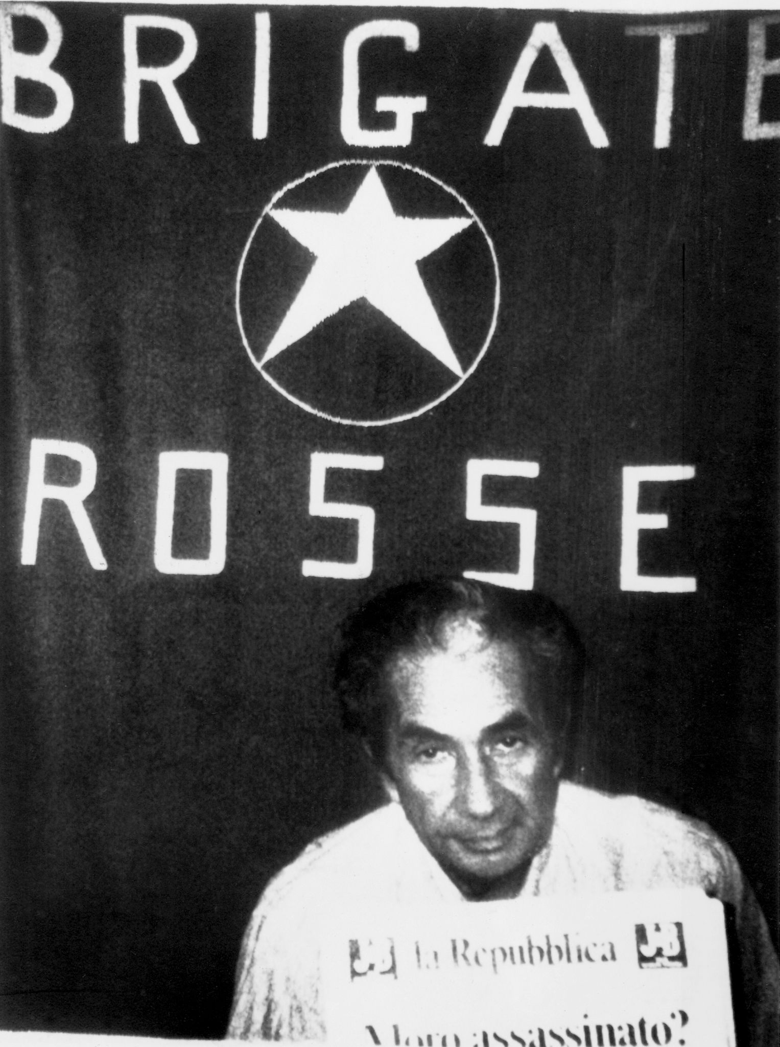 Der italienische Politiker Aldo Moro während seiner Entführungszeit vor einer Fahne der Roten Brigade.