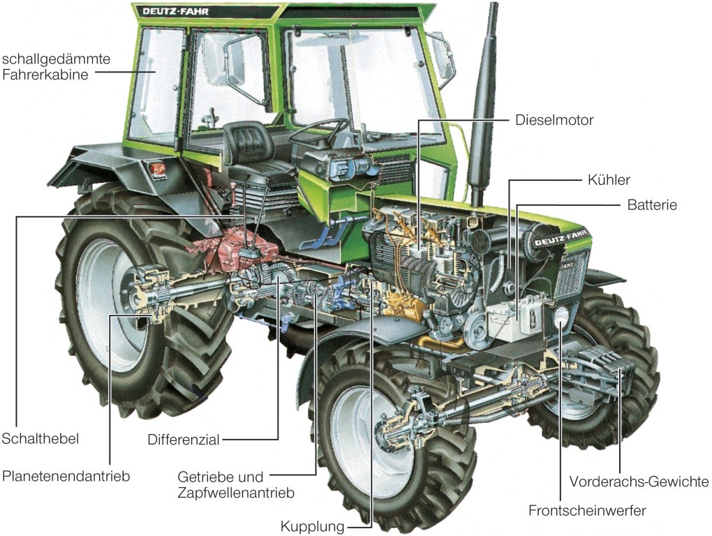 vorwiegend mit Dieselmotoren angetriebene Fahrzeuge zum Ziehen von Anhängern und landwirtschaftlichen Geräten. Die heute in jedem Motorschlepper eingebaute Zapfwelle dient zum Antrieb der gezogenen Maschine, aber auch zur Verwendung des Motorschleppers als stationärer Motor. Der Motorschlepper kann entweder als Radschlepper oder für weichen Boden als Raupenschlepper (Gleiskettenfahrzeug) ausgeführt sein.
