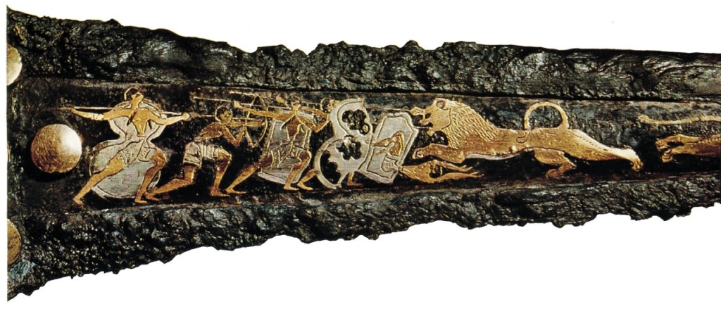 Die bronzene Dolchklinge aus dem 16. Jahrhundert v. Chr. ist mit einer Jagdszene verziert; Archäologisches Nationalmuseum, Athen.