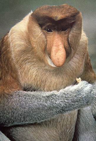 Der Nasenaffe trägt eine menschenähnliche Nasenbildung. Bei den Männchen wächst sie nach Eintritt in die Geschlechtsreife zu einem wahren Nasenungetüm heran.