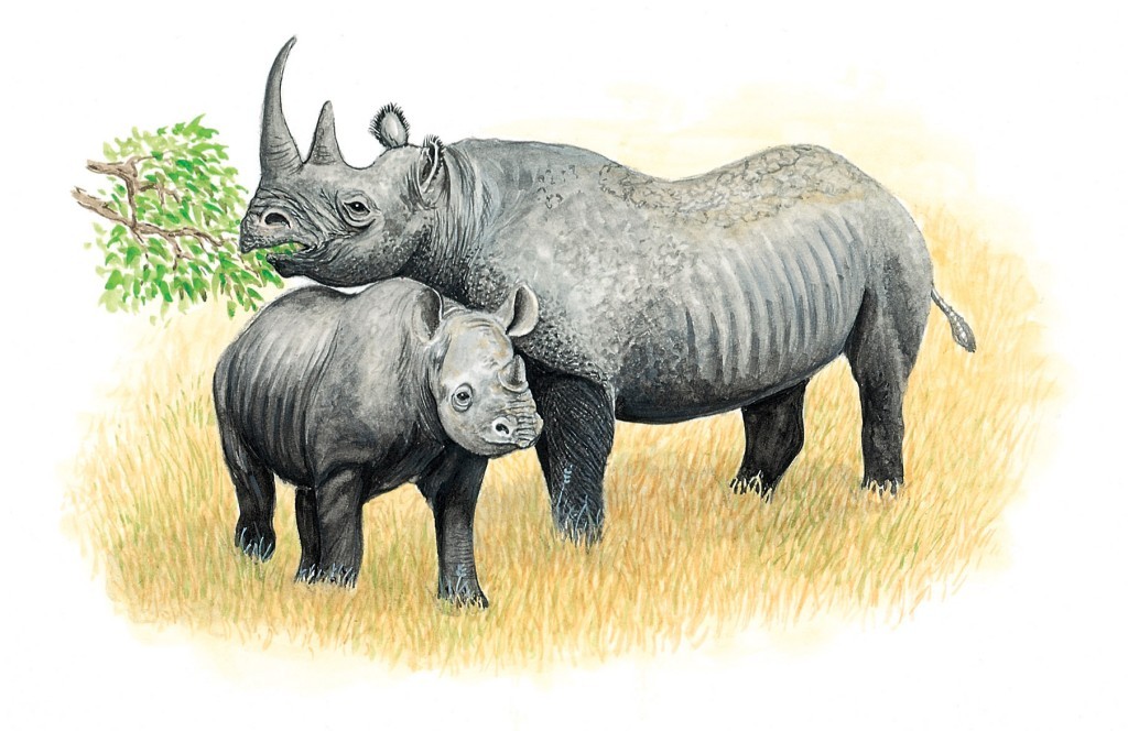 | Das Schwarze oder Spitzlippennashorn, Diceros bicornis (links), und das Weiße oder Breitlippennashorn, Ceratotherium simum (rechts), beide in Afrika vorkommend, kann man leicht miteinander verwechseln: | ||