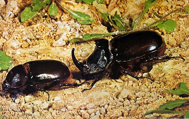 Das Nashornkäferpärchen zeigt sehr schön den starken Unterschied im Aussehen der Geschlechter. Das vorneweg laufende Weibchen hat an Kopf und Vorderbrust nur kleine Erhebungen, während sich beim Männchen dort starke Auswüchse entwickelt haben.