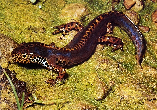 Bei den Bergmolchen trägt das Männchen im Gegensatz zum Weibchen in der Paarungszeit ein farbenprächtiges Hochzeitskleid. Der hier abgebildete Bergmolch kommt in den Alpen bis in 3000 m Höhe in flachen Gewässern vor.
