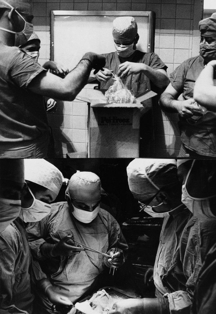 Nierentransplantation in einem Bostoner Krankenhaus: Entnahme des Spenderorgans aus dem Transportbehälter (oben); Implantation des Organs (unten).