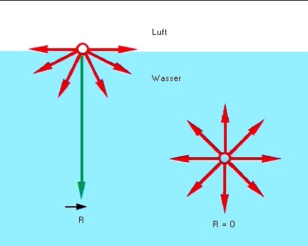 Das Wassermolekül (rechts) erfährt durch seine Nachbarmoleküle Kräfte nach allen Richtungen. Deren Resultierende (Kräftesumme) R ist Null. Dagegen ist R links stark nach innen gerichtet; die Oberfläche ist „gespanntö.