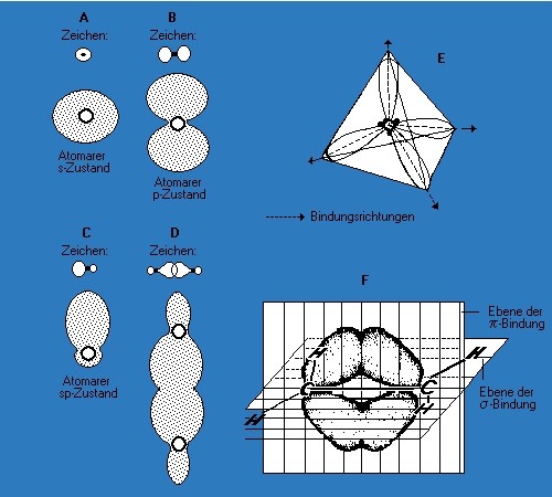Mit Hilfe der Orbitaltheorie ist eine Deutung der Atombindungen (Bindung) möglich, die besonders beim Kohlenstoffatom von Interesse sind. Das Kohlenstoffatom besitzt in der äußeren Elektronenschale 4 Elektronen, die sich im Ruhezustand in zwei s- und zwei p-Zuständen befinden. Im angeregten Zustand „bastardisieren“ alle vier Zustände zu so genannten sp-Zuständen (3), die hier die Vierwertigkeit des Kohlenstoffatoms bedingen. Die gegenseitige Durchdringung der bastardisierten Ladungswolken verschiedener Atome führt durch Resonanz zur Atombindung (4). Die im sp-Zustand befindlichen Elektronen werden als σ-Elektronen bezeichnet, die von ihnen geschaffene Bindung als σ-Bindung. Beim Kohlenstoffatom bedingt die gegenseitige Abstoßung der gleichsinnig geladenen vier sp-Elektronenwolken die Tetraederstruktur der gesättigten Kohlenstoffverbindungen (5).