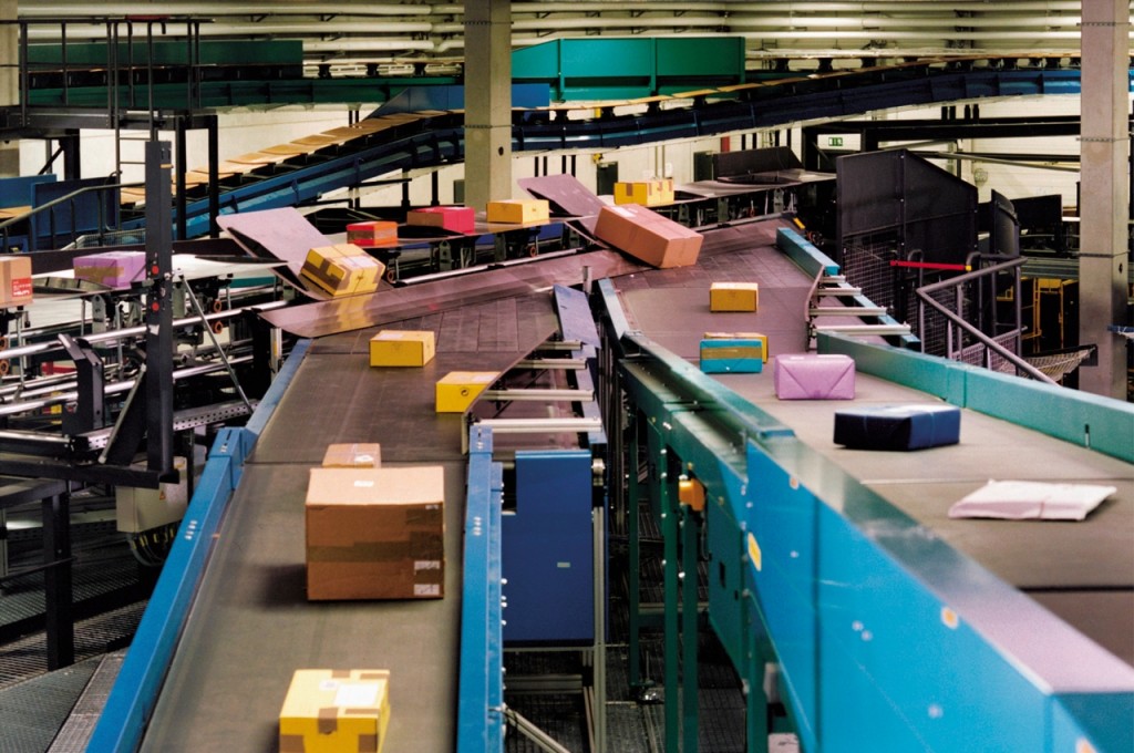 Übergabe der Paketsendungen in einem Frachtzentrum vom Vorsorter auf die Zielführungsbänder zum Hauptsorter.