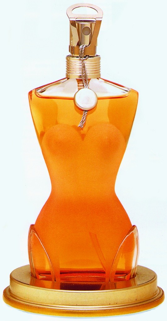 Jean-Paul Gaultiers Flasche ist wie ein weiblicher Torso geformt, der durch ein Korsett Gestalt erhält. Die Verjüngung der Flasche imitiert die weibliche Taille.