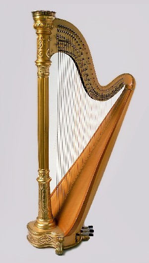 Die Harfe ist ein mit den Fingerkuppen gezupftes Saiteninstrument. Mit den Pedalen wird die Umstimmvorrichtung bedient.