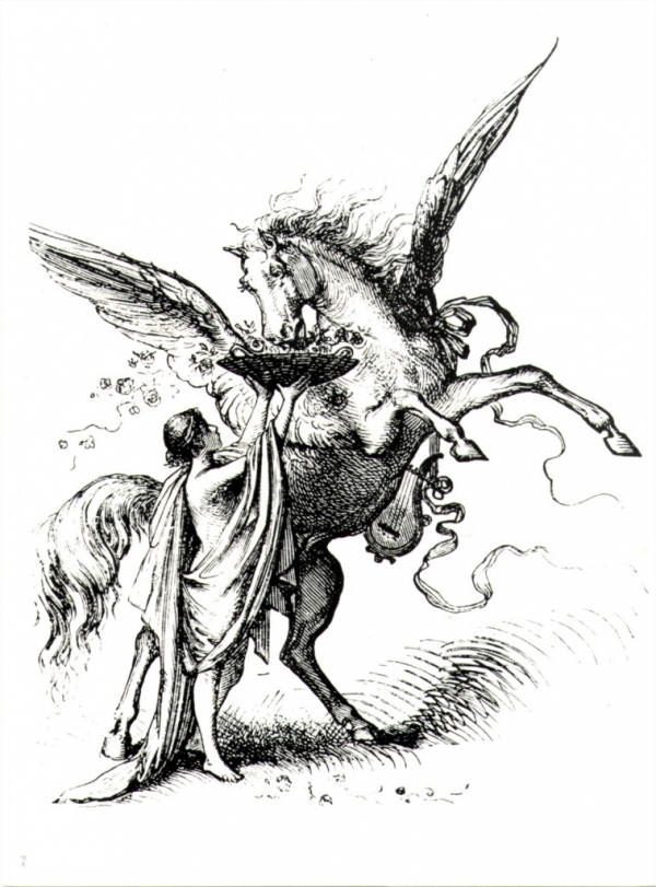 Ein Knabe reicht Pegasus eine Schale mit Rosen. Holzschnitt, 19. Jahrhundert