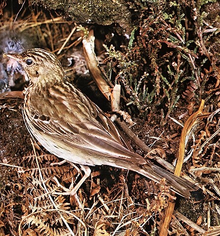 Der Baumpieper, der beste Sänger unter den Piepern, baut sein Nest wie alle seiner Gattung auf dem Boden, wohlversteckt unter Wurzeln und Farnkraut auf Waldlichtungen.