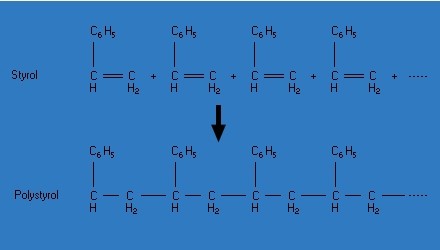 Bei der Polymerisation verbinden sich einzelne Styrolmoleküle zu einem Makromolekül, dem Kunststoff Polystyrol.