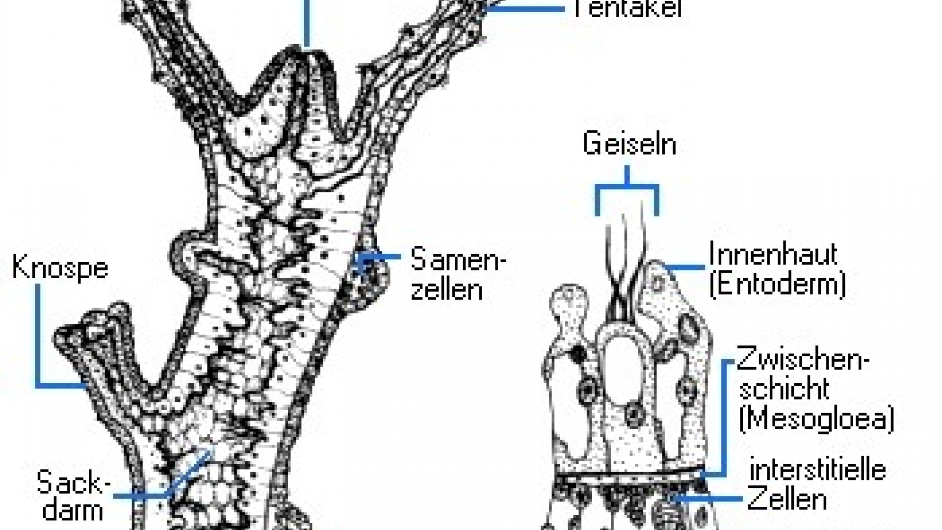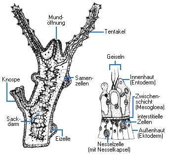 Der Längsschnitt durch einen Süßwasserpolypen zeigt den einfachen, typisch zweischichtigen Aufbau aller Hohltiere. Zwischen den Basen der Ektodermzellen bewegen sich noch bildungsfähige Zellen, die etwa auch neue Nesselzellen nachliefern. Der Süßwasserpolyp vermehrt sich durch Knospung, bringt jedoch keine Medusen hervor.