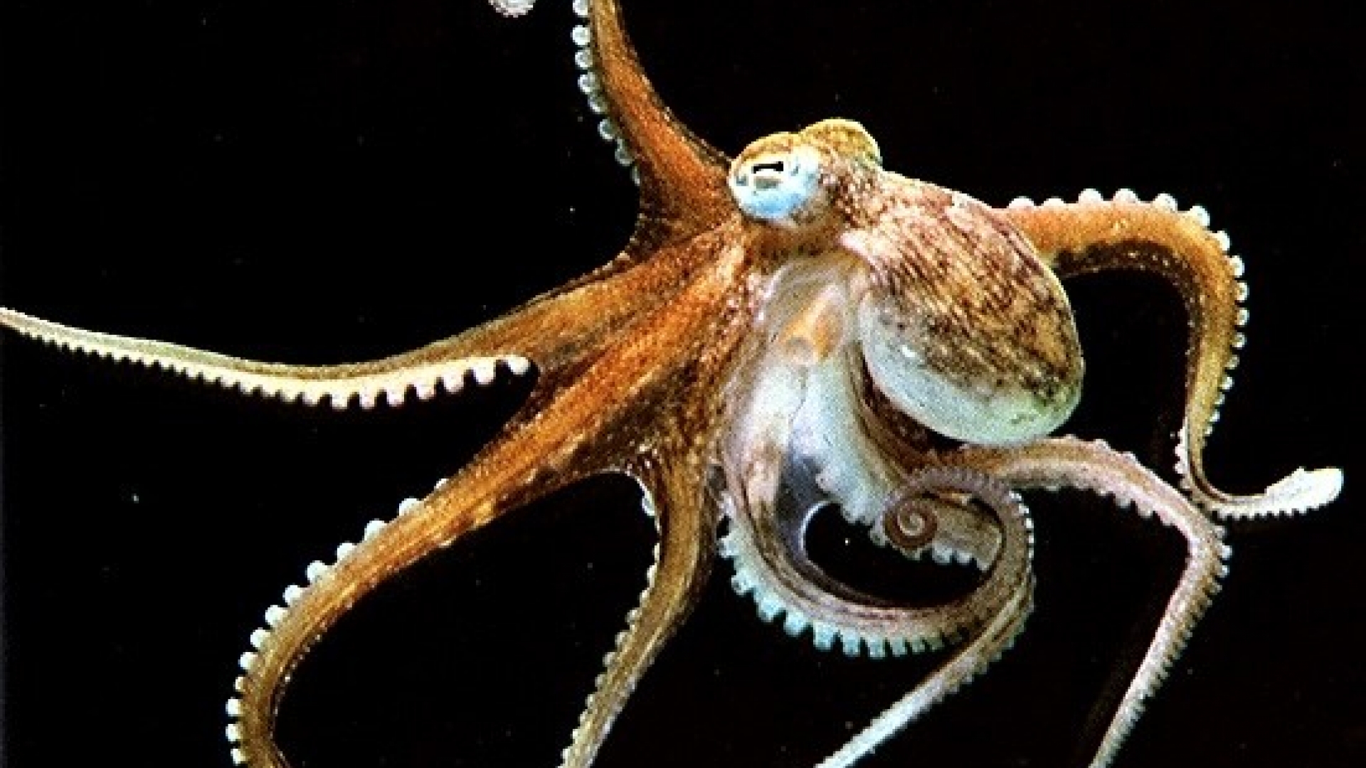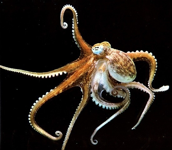 Bei diesem Kraken, einem typischen Vertreter der Kopffüßer, kann man gut die Gliederung des Körpers in Kopf, Eingeweidesack und Fuß sehen, der in Trichter und Arme umgewandelt ist.