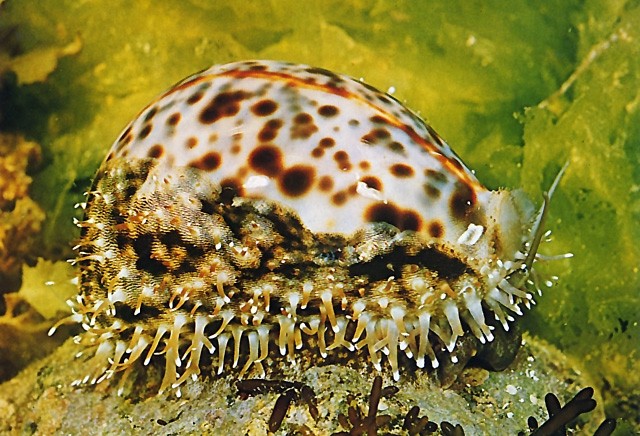 Zu den schönsten Schnecken gehören die Porzellanschnecken (Cypraeidae), deren Gehäuse meist bunt gemustert ist und wie mit Lack überzogen glänzt wie hier bei der Tigerschnecke (Cypraea tigris).