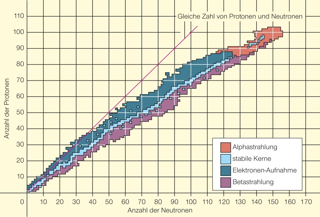 die Eigenschaft mancher chemischer Elemente (Radionuklide, Radioisotope), unter Aussendung einer unsichtbaren Strahlung und Bindung anderer Elemente zu zerfallen. Bei der beim radioaktiven Zerfall auftretenden und aus dem Atomkern stammenden Strahlung unterscheidet man die α-Strahlung, die aus positiv geladenen Heliumkernen, die β-Strahlung, die aus Elektronen oder Positronen besteht, und die γ-Strahlung, die eine energiereiche elektromagnetische Strahlung ist. Wegen ihrer positiven bzw. negativen Ladung werden die Bahnen der α- und β-Strahlung im magnetischen Feld abgelenkt und lassen sich dadurch leicht von der γ-Strahlung unterscheiden. In der Natur kommen die Uran-, die Thorium- und die Actiniumzerfallsreihe vor, die von den Elementen Uran, Thorium und Actinium ausgehen. Bei diesen Zerfallsreihen ist nach Durchschreiten zahlreicher Zwischenstufen, die sich je nach der auftretenden Strahlung und den damit verbundenen Änderungen an positiven Kernladungen aufgrund von Verschiebungssätzen aus dem Periodensystem ergeben, das Blei Endprodukt des Zerfalls. Die Geschwindigkeit des radioaktiven Zerfalls wird durch die Halbwertszeit angegeben, die bei den verschiedenen radioaktiven Elementen zwischen Bruchteilen von Sekunden und Millionen von Jahren betragen kann. Aufgrund der Kenntnis der Halbwertszeit und des Gehalts an radioaktiven Elementen und Zerfallsprodukten kann auf das Alter z. B. eines Gesteins zurückgeschlossen werden (radioaktive Altersbestimmung). Zur Messung der Radioaktivität wird die durch die radioaktive Strahlung bewirkte Ionisation der Luft gemessen (mit Hilfe des Geiger’schen Zählrohrs).
