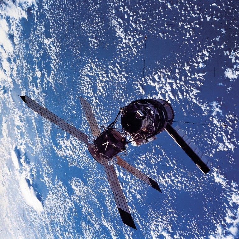Skylab-Raumstation mit Zentralkörper und Solarpaddeln, im Hintergrund der »blaue Planet« Erde