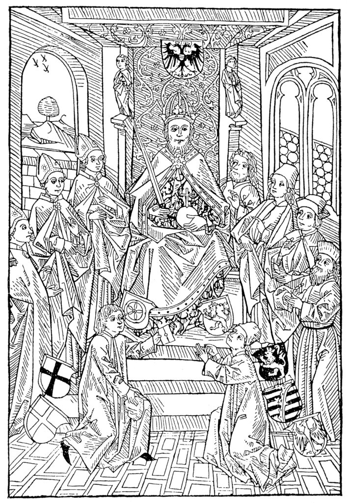 Illustration aus dem Schwabenspiegel, ein Landrechtsbuch, erschienen bei Günther Zainer in Augsburg um 1473.