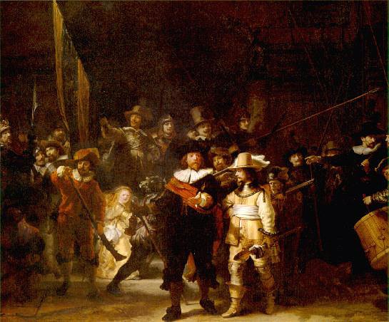 In den Jahren 1642–1650 drängte Rembrandt die barocken Elemente zugunsten einer starken Verinnerlichung zurück; die Form wurde ruhiger, das Kolorit wärmer, die Zeichnung beschränkte sich auf das Wesentliche. Hauptwerke: „Nachtwache“ 1642, Amsterdam, Rijksmuseum; „Christus und die Ehebrecherin“ 1644, London, National Gallery; „Hl. Familie mit Engeln“ 1645, St. Petersburg, Eremitage; „Christus und die Jünger in Emmaus“ 1648, Paris, Louvre; „Noli me tangere“ 1651, Braunschweig, Herzog-Anton-Ulrich-Museum; „Joseph und Potiphars Weib“ 1655, Berlin, Staatliche Museen. – Radierungen: „Die drei Bäume“ 1643; „Christus heilt die Kranken“ („Hundertguldenblatt“) um 1650; „Die drei Kreuze“ 1653.