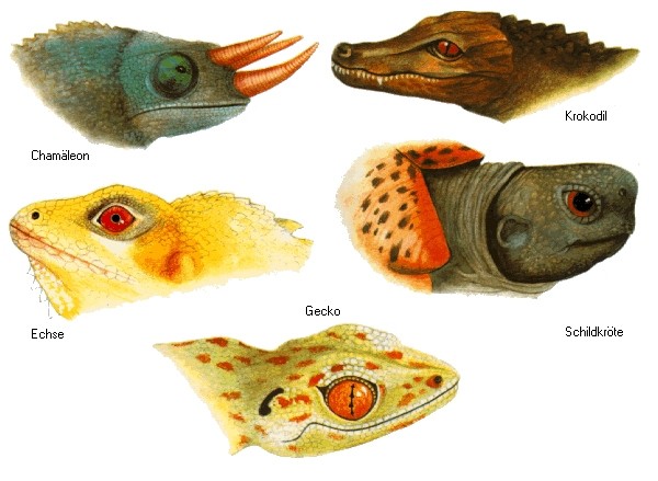 ]Klasse der Wirbeltiere mit den Ordnungen der Brückenechsen, Schildkröten, Krokodile und Schuppenkriechtiere (Echsen, Schlangen und Doppelschleichen). Charakteristika sind eine drüsenarme Haut, die von verhornten Schuppen oder Hornschilden bedeckt ist, und meist 4 Gliedmaßen, die den Körper bei der schlängelnd-kriechenden Bewegung nur unvollkommen vom Boden abheben oder die auch vollständig zurückgebildet sein können, etwa bei den Schlangen. Reptilien sind wechselwarm (poikilotherm), d. h., ihre Körpertemperatur hängt von der Umgebungstemperatur ab. Die Herzkammern sind nicht völlig voneinander getrennt. Die Atmung erfolgt durch Lungen. Sie pflanzen sich meist durch Eier fort oder sind lebend gebärend, ohne Metamorphose. Die Reptilien bilden eine sehr alte Wirbeltiergruppe, die erstmalig im Karbon auftrat. Ihre Blütezeit hatten sie vor 220–65 Mio. Jahren mit den Dinosauriern. Die überwiegende Zahl starb in der Kreidezeit aus. Heute sind noch etwa 7000 vorwiegend landbewohnende Arten bekannt. Die meisten von ihnen leben in den warmen Gebieten der Erde. Viele sind in ihrem Bestand gefährdet. Von den europäischen Arten gelten rd. 45% als vom Aussterben bedroht.