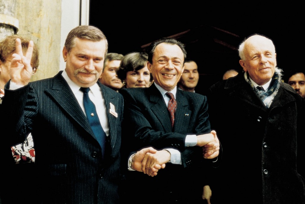 Der französische Premierminister Michel Rocard (Mitte) mit dem polnischen Gewerkschaftsführer Lech Wałęsa (links) und dem russischen Bürgerrechtler Andrej Dmitrijewitsch Sacharow (rechts) 1988 in Paris.